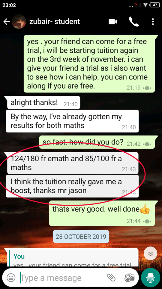 “Teacher I got A2 for A-Math! Thank you for guiding me thru Sec 4 year ”