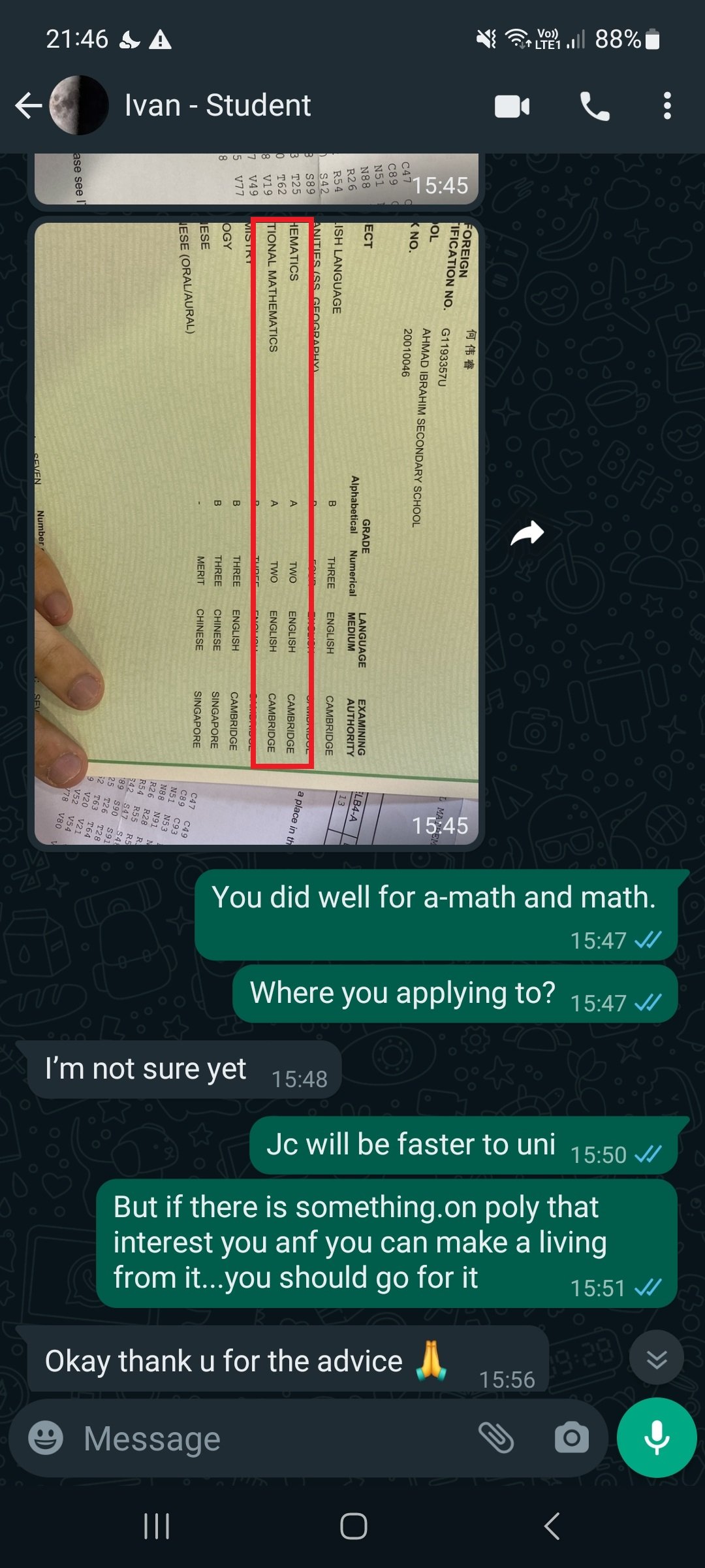 “Hi Jason, thank you so much for teaching me E-Math and A-Math. I got a B3 for my O Level A-Math. I pass my A-Math for the first time in the whole year. Thank you so much.”